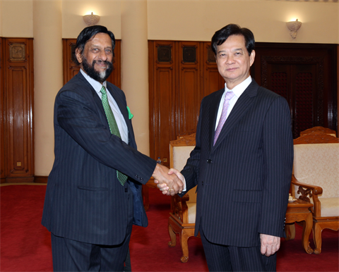| Le Premier ministre vietnamien Nguyên Tân Dung (droite) et le président du Groupe intergouvernemental sur l'évolution du climat (GIEC), Rajendra Pachauri, le 21 janvier à Hanoi |