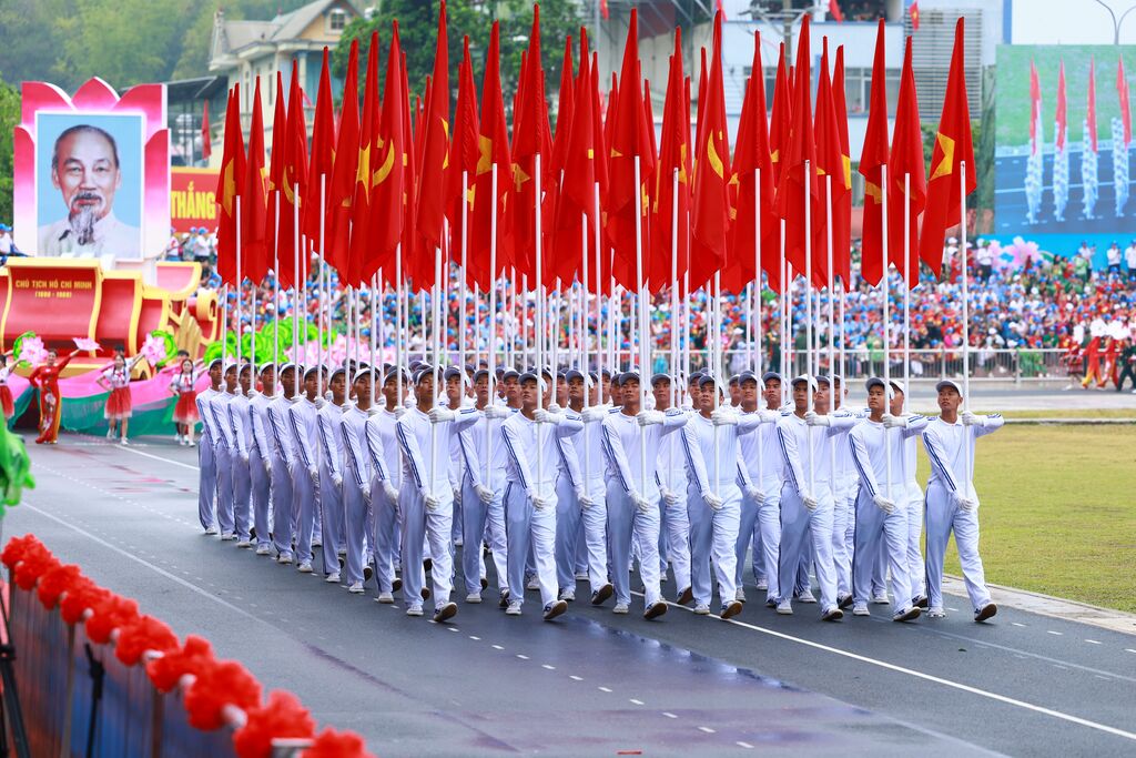 | Défilé du drapeau du Parti et du drapeau national lors du 70e anniversaire de la Victoire de Diên Biên Phu. |