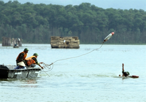| Démonstration de recherche et de sauvetage des victimes des crues et de tempêtes de l'armée populaire du Vietnam, le 9 août en banlieue de Hanoi. |