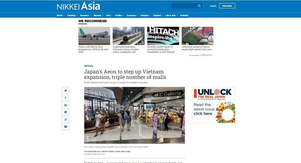 Citant la source du journal Nikkei Asia, le correspondant de l’Agence Vietnamienne d’Information (VNA) au Japon a informé qu’avec près de 40 ans d'opération en Asie du Sud-Est, AEON accélérait l'augmentation du nombre de ses supermarchés et centres commerciaux au Vietnam afin d'exploiter ce marché ayant un nombre croissant de la classe moyenne et de profiter de sa suppression des limites pour les détaillants étrangers.