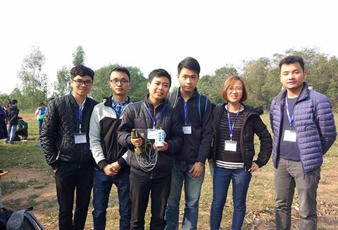 | L’équipe FIMO de l'Université de technologie (relevant de l'Université nationale de Hanoï) présente son satellite lors du concours Cansat 2017 organisé par le VNSC. |