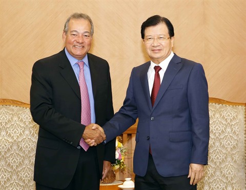 | Bernerd Da Santos (gauche), vice-président et directeur général de la société AES Corp., reçu par le vice-Premier ministre Trinh Dinh Dung, le 23 août à Hanoï. |