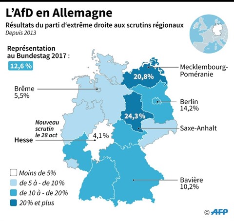 Avec un score attendu autour de 13%, le parti d'extrême droite Alternative pour l'Allemagne (AfD), né il y a cinq ans seulement, devrait achever son implantation régionale en étant désormais représenté dans les parlements des 16 Länder.
