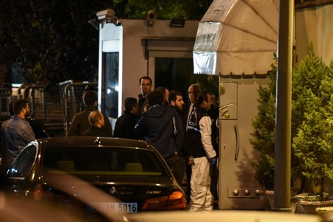 | Des policiers turcs et d'autres responsables entrent dans le consulat d'Arabie saoudite à Istanbul, le 15 octobre. |