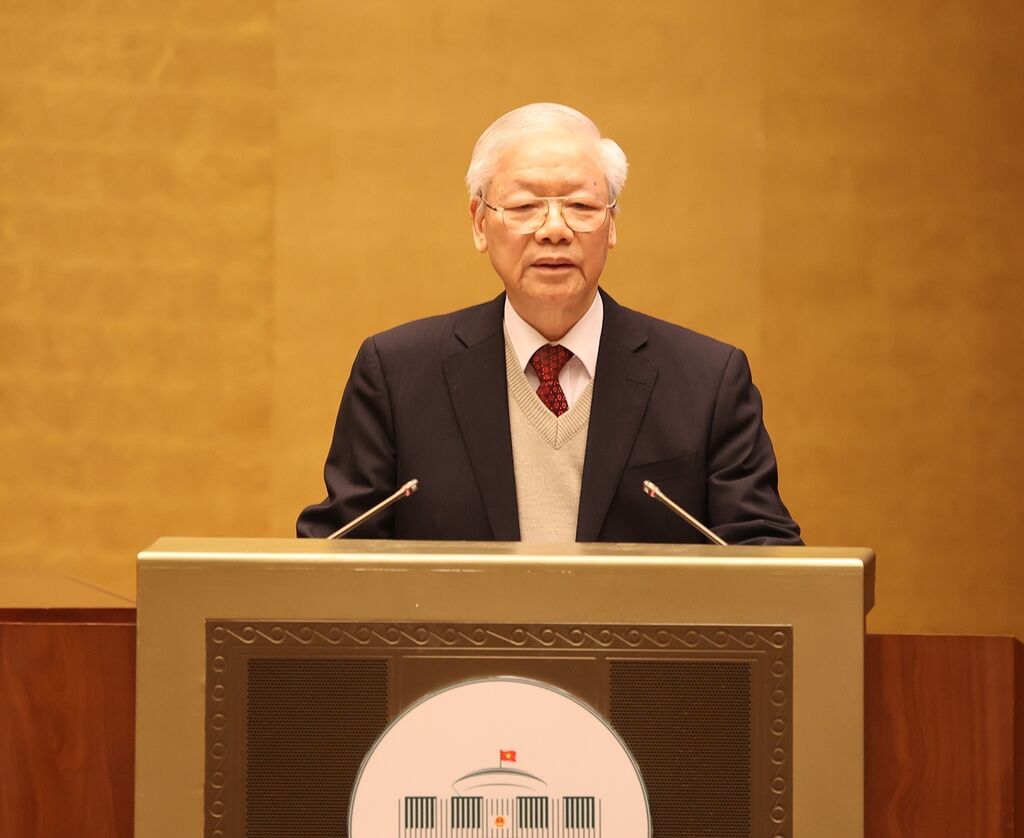 | Le secrétaire général du Parti, Nguyên Phu Trong, s'exprimant lors d'une conférence. |