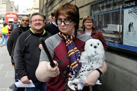 | Des fans de Harry Potter font la queue devant la Bibliothèque nationale d'Ecosse à Edimbourg. |