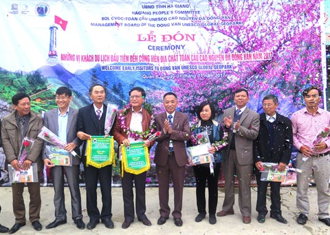 Nguyen Lê Huy, directeur du Comité de gestion du parc géologique mondial du plateau calcaire de Dông Van, a remis des fleurs et cadeaux à ces touristes, tout en souhaitant qu'ils deviennent des ambassadeurs touristiques pour présenter à leurs amis la beauté de la terre, de la culture et de la population de Hà Giang.