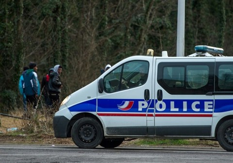 | Des migrants et une voiture de police à Calais, le 3 mars 2017. |