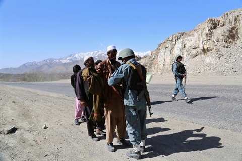 | Des policiers afghans contrôlent des civils sur une route de la province de Wardak, en 2013. |