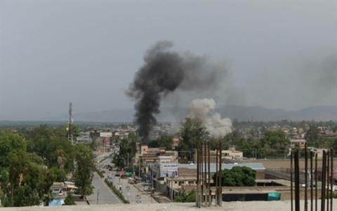 | De la fumée s'échappe d'un bâtiment gouvernemental lors d'une attaque à Jalalabad, le 13 mai. |