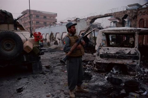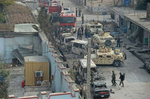 | Les forces de sécurité afghanes en train d'inspecter le site de l'ONG britannique Save the children à Jallabad, attaqué par l'EI le 24 janvier. |