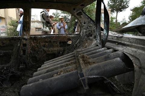| Une voiture endommagée, après des tirs de roquettes à Kaboul le 30 août. |
