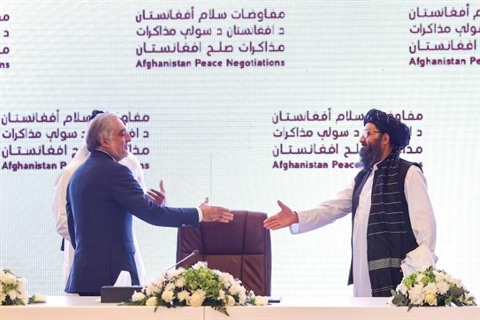 | Le chef du Haut conseil pour la réconciliation nationale Abdullah Abdullah (gauche) et le chef de la délégation des talibans aux pourparlers de Doha, le mollah Abdul Ghani Baradar, le 18 juilletà Doha. |