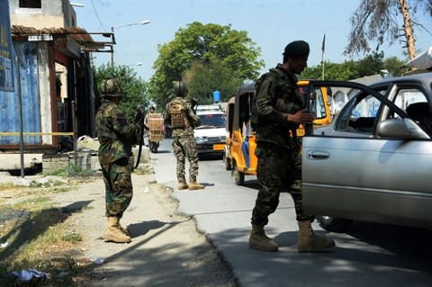 | Des soldats afghans fouillent des véhicules à un barrage à Jalalabad, le 1er août. |