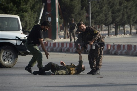 | Les forces de l'ordre aident un de leurs collègues blessés après l'attentat suicide du 22 juillet à Kaboul. |