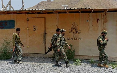 | Des soldats de l'armée afghane marchent dans une base américaine à Achin, le 26 juillet 2020. |
