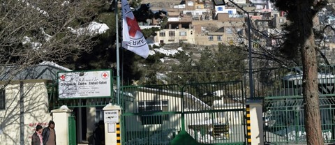 | L'entrée d'un centre médical de la Croix Rouge (CICR) à Kaboul le 9 février 2017. |