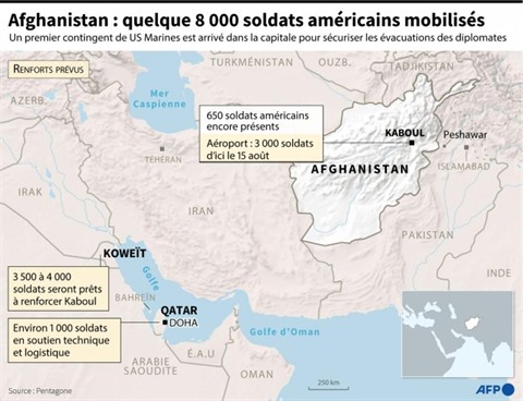 Face à l'effondrement de l'armée afghane, le président américain Joe Biden a porté à 5.000 soldats le déploiement militaire à l'aéroport de Kaboul pour évacuer les diplomates américains et les civils afghans ayant coopéré avec les États-Unis qui craignent pour leur vie, menaçant des talibans de réponse "rapide et forte" en cas d'attaque contre des intérêts américains.