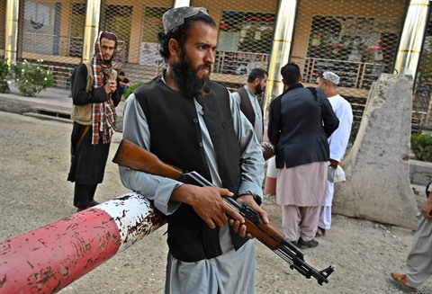 | Un combattant taliban garde l'entrée du bureau des passeports à Kaboul, en octobre 2021. |