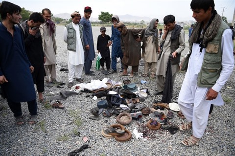 | Des hommes rassemblés autour de vêtements appartenant à des victimes des explosions ayant eu lieu le 3 juin 2017 à Kaboul. Photo : AFP/VNA/CVN |