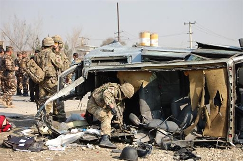 | Un soldat de l'Isaf inspecte le véhicule de l'ambassade britannique après un attentat suicide taliban à Kaboul, le 27 novembre en Afghanistan |