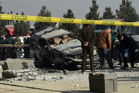| Des agents de sécurité afghans inspectent un véhicule détruit par l'explosion d'une bombe, le 28 décembre à Kaboul. |