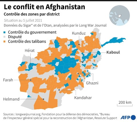 Face à des soldats désormais privés du crucial soutien aérien américain, les talibans ont intensifié leurs offensives ans le Nord ces derniers jours, s'emparant du gros des provinces du Badakhshan et du Takhar, où les troupes gouvernementales ne contrôlent désormais qu'à peine plus que les capitales provinciales.