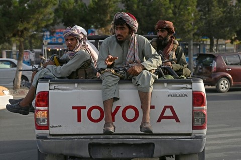 | Des talibans en patrouille dans une rue de Kaboul, le 23 août. |
