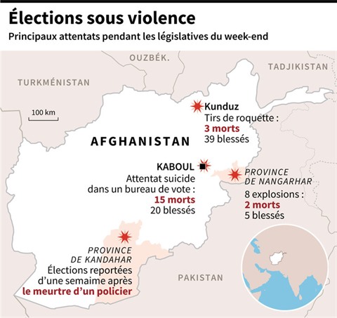 | Carte de l'Afghanistan localisant les principaux attentats du week-end pendant les élections législatives. |