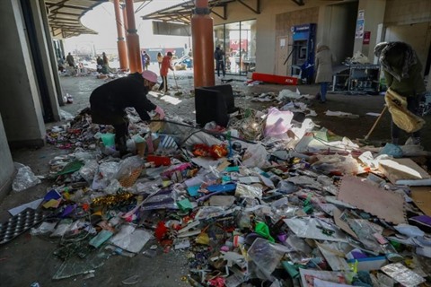 | Des volontaires nettoient les magasins après les pillages à Soweto, Johannesbourg, en Afrique du Sud, le 14 juillet. |