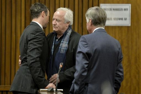 | Oscar Pistorius (gauche) et son père (centre) dans la salle d'audience, le 8 août |
