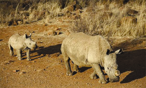 | Un rhinocéros à la corne coupée suivi de son petit, à Klerksdorp en Afrique du Sud. |