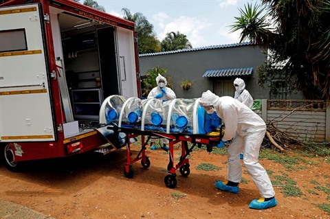 | Un homme présentant des symptômes du COVID-19 est transporté dans une ambulance, le 15 janvier à Pretoria, en Afrique du Sud. |