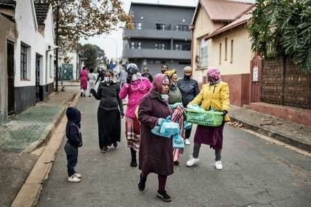 | Un groupe de femmes à Johannesburg le 27 avril où le confinement a fait grimper les violences domestiques. |