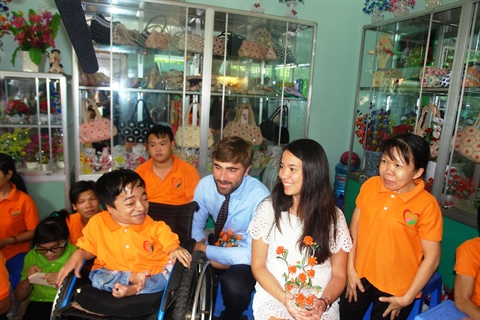 | Me Bertrand Repolt et Me Amélie Lefebvre à côté des victimes de l’agent orange/dioxine au Musée des vestiges de la guerre à Hô Chi Minh-Ville. |