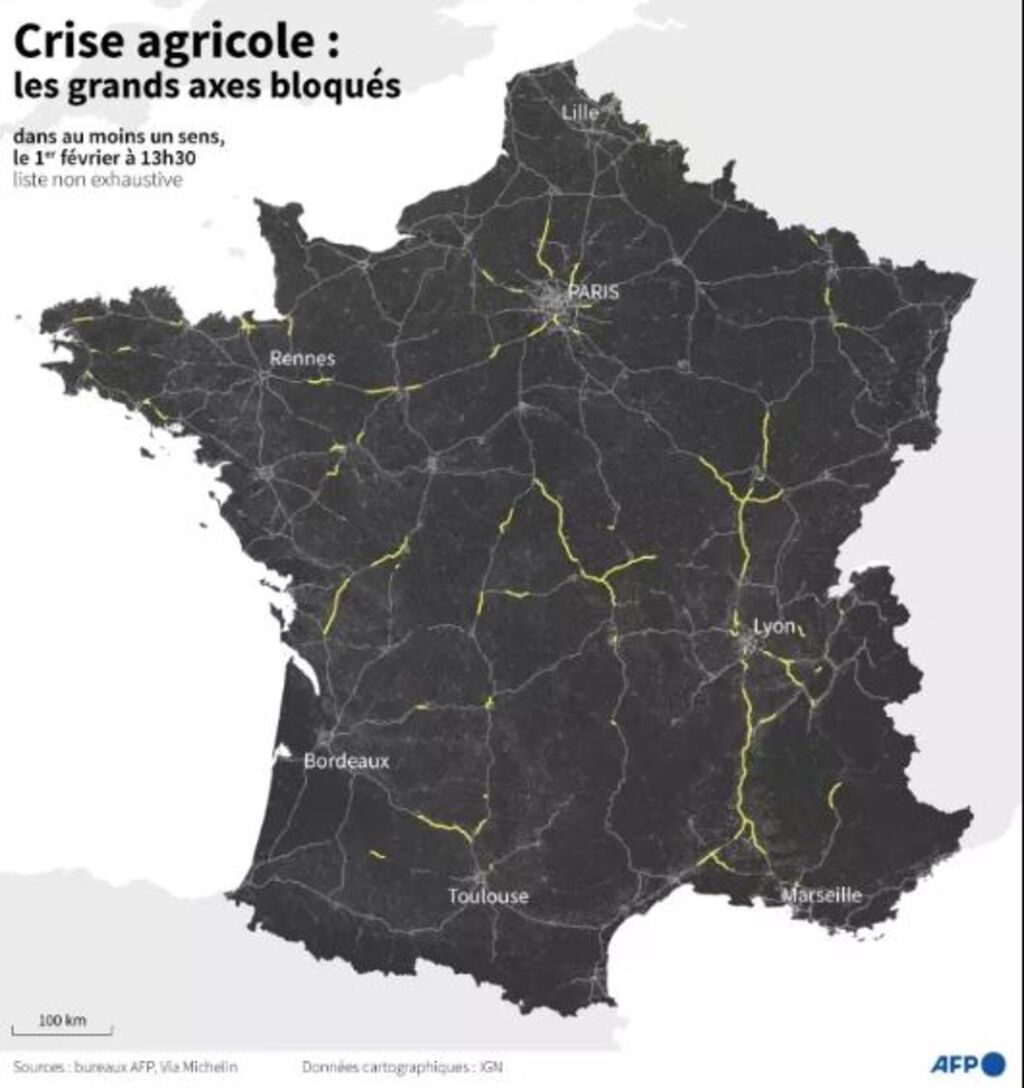 | Carte non exhaustive des grands axes français bloqués le 1er février 2024 par les agriculteurs. |