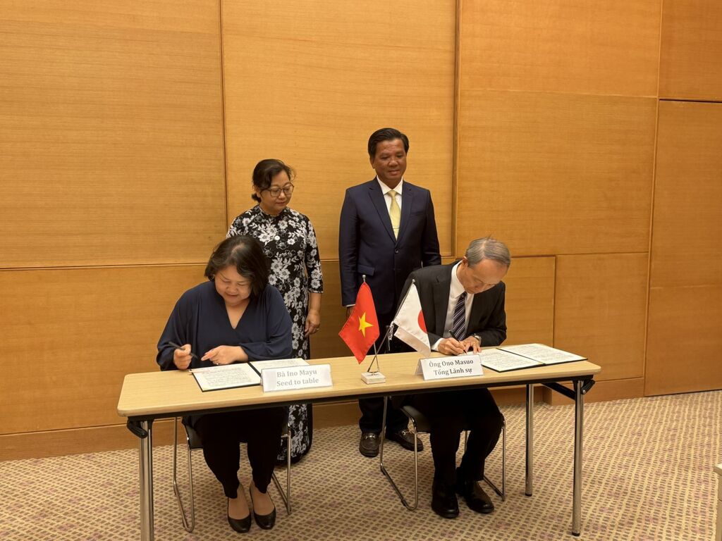 | Ono Masuo, consul général du Japon à Hô Chi Minh-Ville, et Ino Mayo, représentante en chef de l'organisation Seed to Table, ont signé l'accord d'aide non remboursable. |