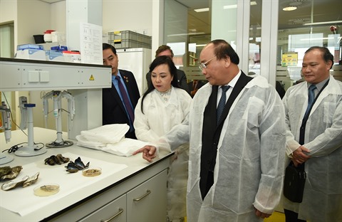 | Visite du Premier ministre vietnamien Nguyên Xuân Phuc (centre) au Centre des recherches RIKILT de l'Université Wageningue, à Gueldre, aux Pays-Bas, le 10 juillet 2017. Photo: Gouvernement vietnamien/CVN |
