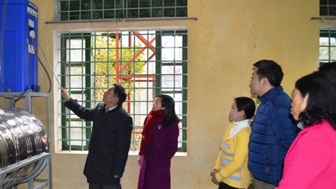 | Le docteur Bùi Công Tho apprend aux enseignants l’utilisation et l’entretien d’une machine de filtration d’eau pure. |
