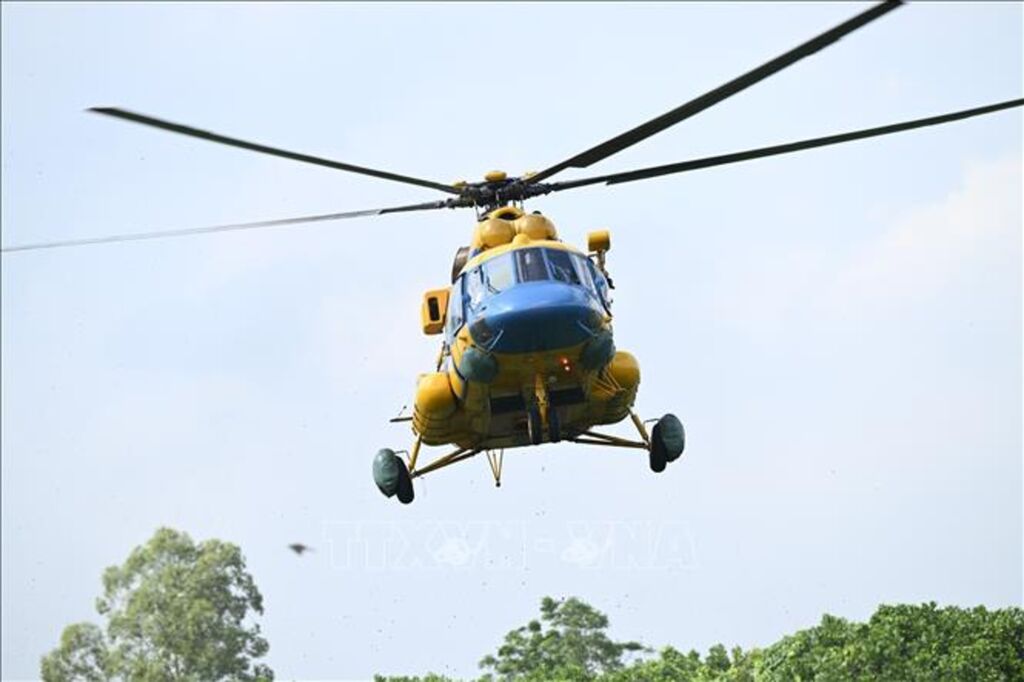| Un hélicoptère participant à un exercice visant à évaluer la capacité des soldats de maintien de la paix des Nations unies au Centre national d'entraînement 4. |
