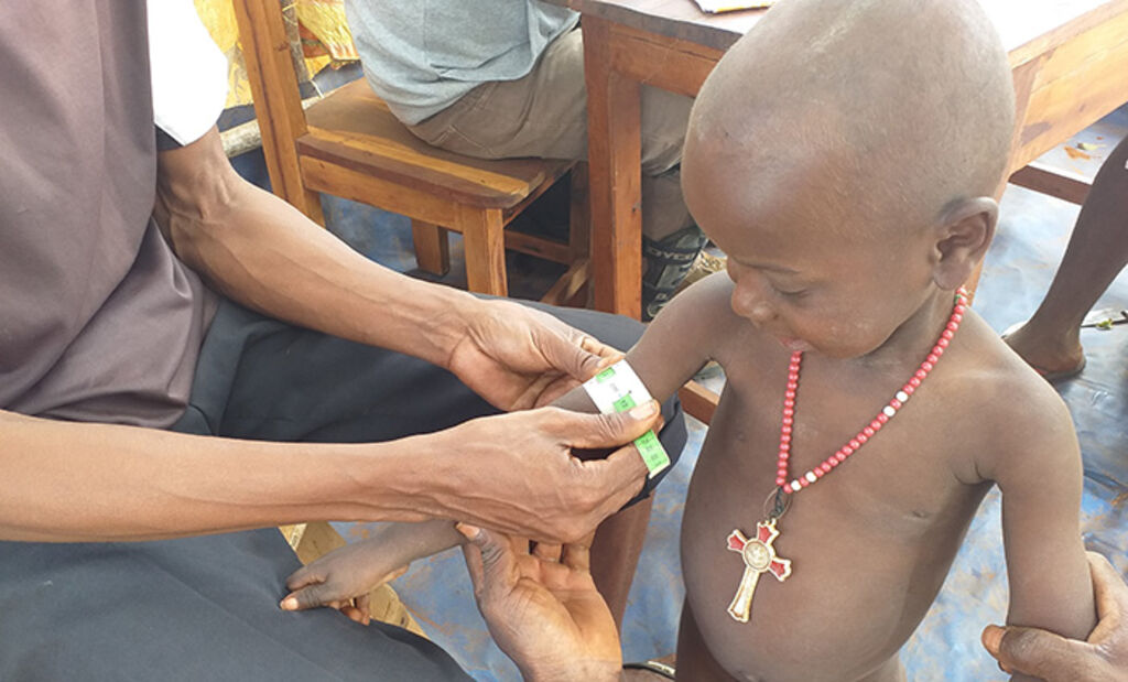 | Mesure du tour de bras d’un enfant pour évaluer son état nutritif. |