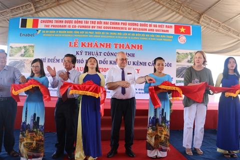 | Cérémonie d’inauguration du canal Câu Ngoi à Ninh Thuân le 24 juin en présence de Paul Jansen (centre), ambassadeur belge, Luu Xuân Vinh, président du Comité populaire de la province de Ninh Thuân (gauche), et de Krista Verstraelen (droite), représentante de l’Enabel au Vietnam. |