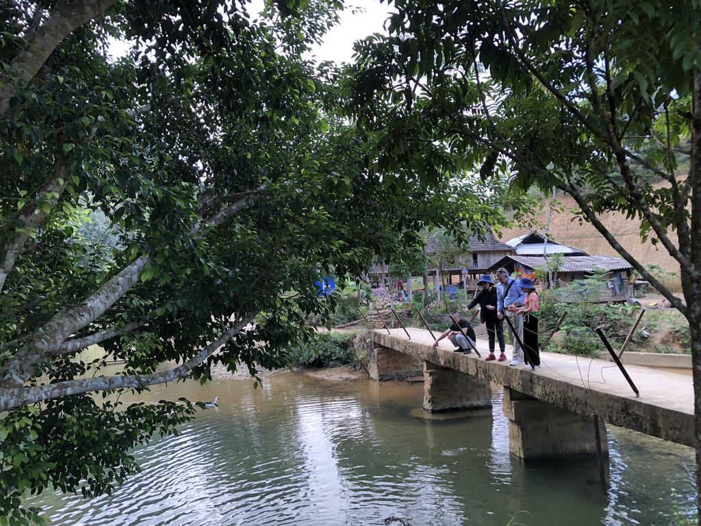 | Sous le guidage d'une femme locale, les touristes visitent le ruisseau qui traverse le village de Bướt qui abrite plus d'une douzaine d'espèces de poissons. |