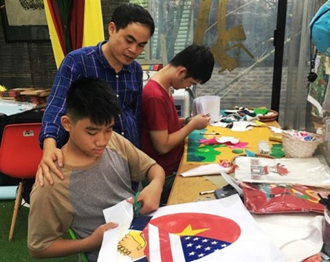 | Le directeur de la coopérative Vun Art, Lê Viêt Cuong (centre), enseigne des personnes handicapées à faire des produits artisanaux en morceaux de tissus. |