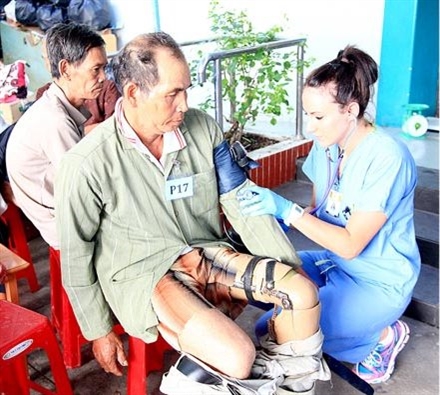 | Une étudiante de l’Université américaine Mercer offre des consultations et des traitements médicaux gratuits à un handicapé pauvre de Bên Tre (Sud). |