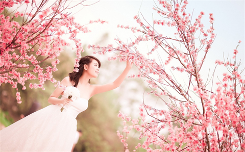 Em nấp sau hoa khúc khích cười,