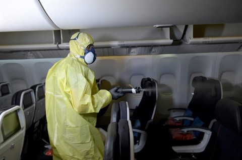 Dans la cabine d'un Boeing 777 qui doit décoller vers Dakar, un homme en combinaison jaune à capuche, masque et lunettes de protection, remonte les allées en tenant une petite lance qui nébulise un produit virucide. "Il est efficace dans la durée, on le fait tous les cinq jours depuis mi-mars", explique Yasmine Geha, ingénieure cabine.