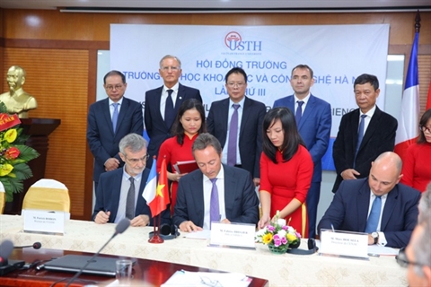 | Le président et directeur exécutif du groupe d'Airbus, Fabrice Brégier, signe deux mémorandums avec l'Université des sciences et des technologies de Hanoï (USTH) |