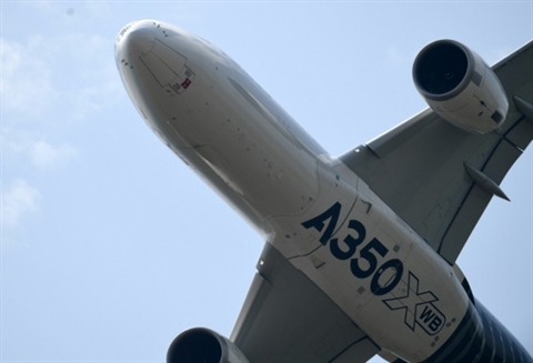 | Un Airbus A350 au dessus de l'aéroport de Schoenefeld, le 31 mai à Berlin. |