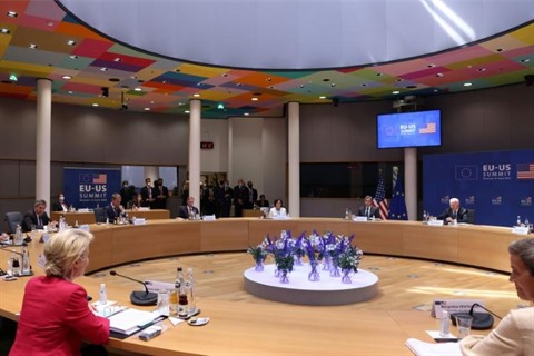 | La présidente de la Commission européenne Ursula von der Leyen (gauche) lors d'un sommet UE-USA, le 15 juin à Bruxelles. |